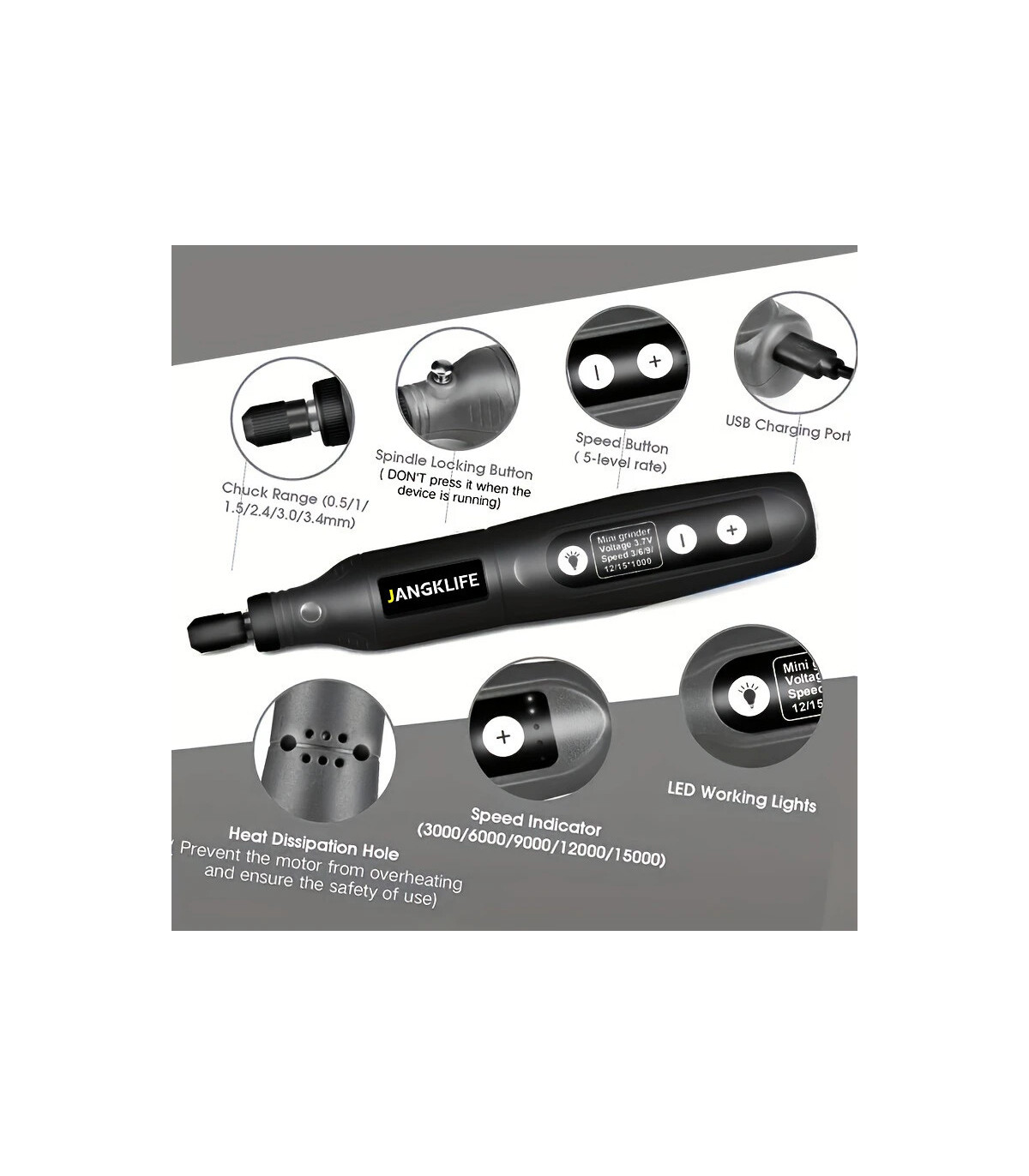 5 Velocità di rotazione controllate da un solo pulsante - 3000/6000/9000/12000/15000 rpm, mostrate chiaramente con tre luci rosse sul corpo dell'utensile. Può soddisfare diverse esigenze contro le vostre esigenze.